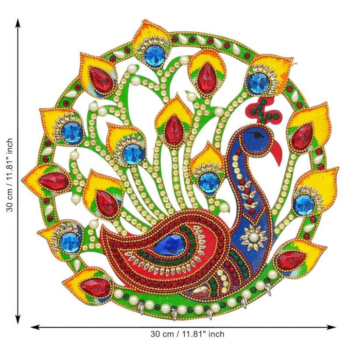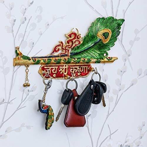Porte-clés mural en bois : Flûte de Krishna/plume de paon