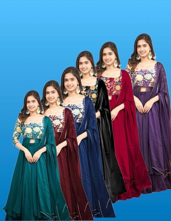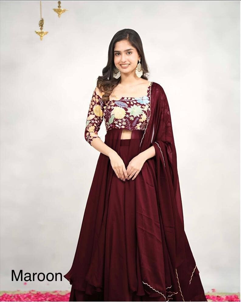 Le haut est en soie avec des impressions et la jupe en georgette haut de gamme. L'écharpe est en georgette haut de gamme avec bordure et découpe.